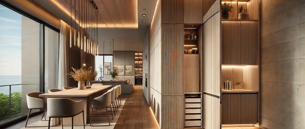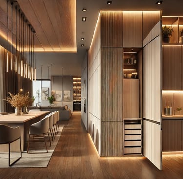 Multifunctional Areas: Like kitchens or living rooms, where concealed cabinetry can reveal appliances, entertainment units, or storage on demand.